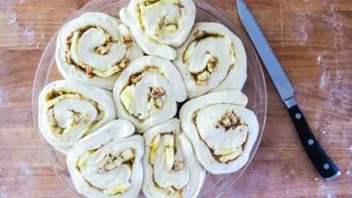На слегка посыпанной мукой поверхности раскатайте тесто в большой прямоугольник. Выложите смесь из коричневого сахара и сливочного масла поверх теста, сверните его в рулет и прищипните шов. Нарежьте на кусочки толщиной 3 см и положите срезом вверх на слегка смазанный маслом противень. Накройте и дайте подняться 30 минут или накройте и поставьте в холодильник на ночь. Если вы будете печь сразу, разогрейте духовку до 200 С.