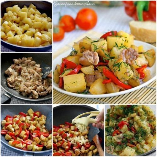 2 средних баклажана, 6-7 средних сырых картофелин, 8 небольших кусочков курятины ( у меня с грецкий орех размером), 2 шт. болгарского красного перца, репчатый лук 2 шт. средних, укропа на посыпку (обязательно, он подчеркивает вкус), 4 зубочка чеснока, 1 ст. л. лимонного сока.