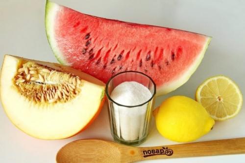 . Засыпаем арбуз и дыню сахаром и оставляем на 8-10 часов, я оставляла на ночь. Выжмем из лимона сок. Цедру натрем на мелкой или средней терке. Добавим цедру и сок в кастрюлю. Поставим кастрюлю на огонь и доведем массу до кипения. Варим 5-10 минут, периодически снимая образовавшуюся пену. Оставим варенье до вечера, а затем варим такое же количество времени. Таким образом проварим еще два раза - следующим утром и вечером. За это время варенье должно хорошо увариться. С помощью погружного блендера превратим варенье в однородную массу, доведем до кипения и снимем с огня. Разложим варенье в стерилизованные банки и закроем. Банки перевернем верх дном, укутаем и оставим до остывания. Варенье из арбуза и дыни готово. Храним в прохладном месте. Пока варенье горячее, оно не очень густое, но по мере застывания будет сгущаться. Из указанного количества получается 1, 5 литра варенья. Удачных заготовок!
