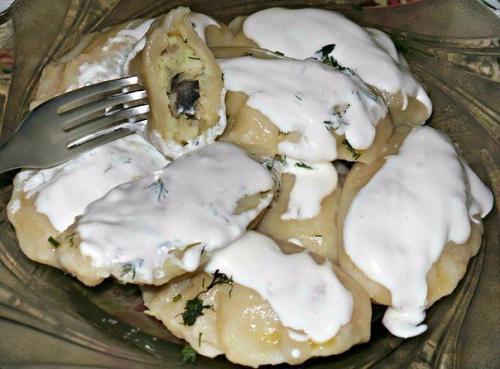 В муку добавляем соль и растительное масло. Тоненькой струйкой вливаем горячее молоко. И интенсивно перемешиваем. Вымешиваем тесто до однородной массы. Заварное тесто без добавления муки раскатываем. Тесто пластичное и не пристаёт к поверхности. Формой кружочки для будущих вареников вырезаем. Для начинки отвариваем картофель и обжариваем лук и грибы на сковороде. Солим и перчим. Готовим пюре, кто как больше любит, у каждого свой рецепт пюре. Смешиваем картофель с грибами. Начинка готова для вареников с картошкой! Раскатываем тесто. Вырезаем круги, выкладываем в центр чайную ложки начинку, формируем вареники и закрепляем края косичкой. Варим вареники с картошкой в подсоленной воде до готовности. При подаче можно добавить немного растопленного сливочного масла. Вареники готовы с картошкой из заварного теста! Приятного аппетита!
