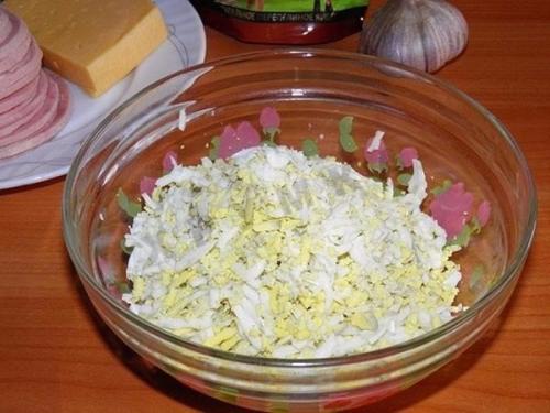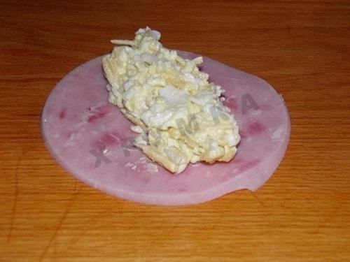 Ингредиенты простые и доступные. Яйца мы натираем на средней терке. Сыр также натираем на средней терке. Добавляем измельченный чеснок. Я на мелкой терке натираю. Заправляем майонезом, перемешиваем. На кружки ветчины выкладываем начинку, закручиваем. Укладываем на тарелку швом вниз