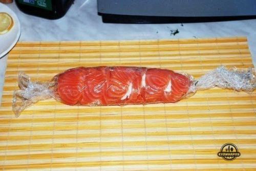 Берем бамбуковую циновочку (часто продают ее, как коврик - подставку под посуду), кладем на нее пищевую пленку. На пленку выкладываем с небольшим перехлестом тонко порезанную рыбу. На рыбу начинку, приблизительно по 5-7 мм. Толщиной. Посередке - несколько полосочек порезанного огурчика. Огурчик вообще нужен для свежести и для хрумскости.