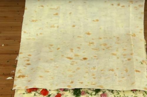 4. выложите еще один слой закуски, используя те же ингредиенты. Завершите приготовление блюда, накрыв третий слой лавашом. Предварительно смажьте его плавленым сыром.