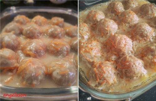 Приготовить фарш, хорошенько отбить и убрать в холодильник на час - два, морковь натереть на терке, лук мелко порезать, обжарить в небольшом кол -ве раст. Масла лук с морковью, разболтать в стакане теплой воды муку (чтобы не было комочков) и залить обжарку, довести до кипения и добавить горячей воды, чтобы получилась консистенция киселя из фарша скатать шарики, сложить в форму для выпечки и залить подливкой, запекать в духовке 30-40 мин. При t 160-180".