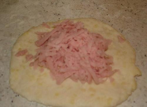 3. полученное тесто разделить на колобки, раскатать небольшую лепешку (можно пожарить так), положить начинку (у меня - ветчина.