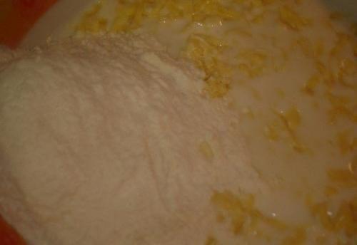 2. добавить сыр твердых сортов и муку. Хорошо перемешать.