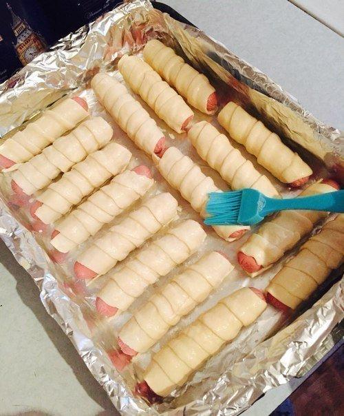 3. теперь берем сосиски и обворачиваем их тестом, кладем на заранее обвернутый фольгой противень (фольгу надо смазывать маслом, чтобы ваши сосиски не подгорали и хорошо отходили).
