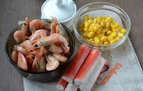 3. смешайте измельченные крабовые палочки, консервированную кукурузу и креветки.