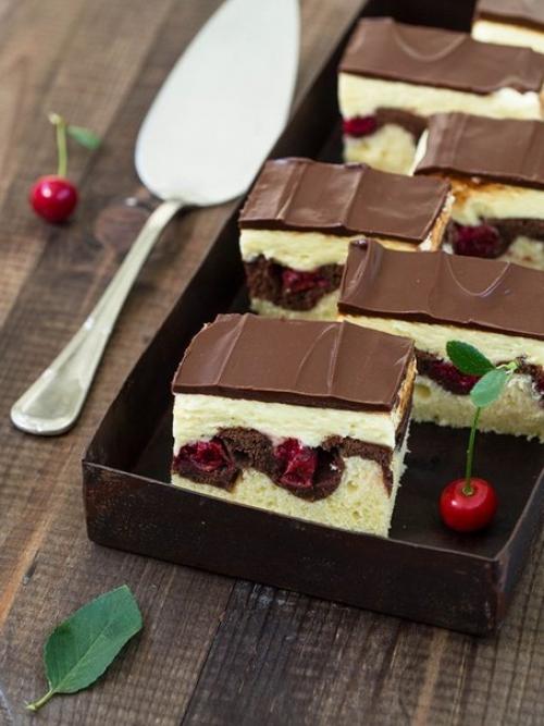 5. в меньшую часть теста добавить какао и молоко, перемешать, выложить поверх светлого теста. Сверху разложить вишни и легонько вдавить каждую.