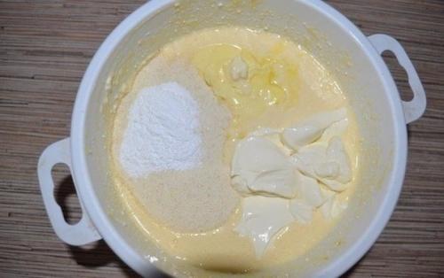 2. затем добавим масло, манку, разрыхлитель и сметану. Тщательно перемешиваем до однородности.