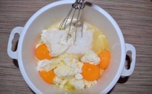 2. сначала творог мы смешаем с сахаром, ванилином и яйцами.