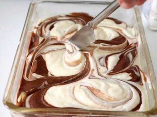 6. вылейте половину белого теста в форму, разровняйте лопаточной. Вылейте шоколадное тесто и закройте оставшимся ванильным (не перемешивайте пока. Теперь ножом сделайте легкий рисунок по сырому тесту (S или вперед - назад зиг - загом. Но не переусердствуйте, иначе не получится эффект мрамора.