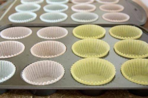 1. разогрейте духовку до 190 с. застелите формы для маффинов (на 24 маленьких маффина) бумажными чашечками.