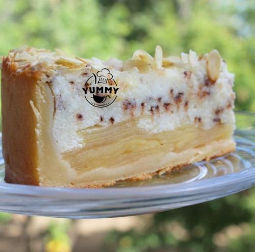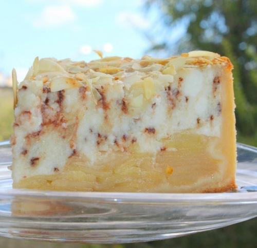6. на тесто выложить яблоки - я всегда присыпаю дно парой столовых ложек манки, чтобы дно не было мокрым, если яблоки сочные. На них вылить творожный крем. Верх миндальными лепестками посыпать.