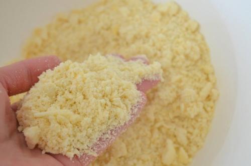 2. к муке добавить сыр и масло, руками мы растираем все в крошку.