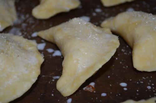 6. выкладываем на противень, застеленный пергаментом или ковриком для выпечки, обмазать молоком и на каждый пирожок посыпать сахар.