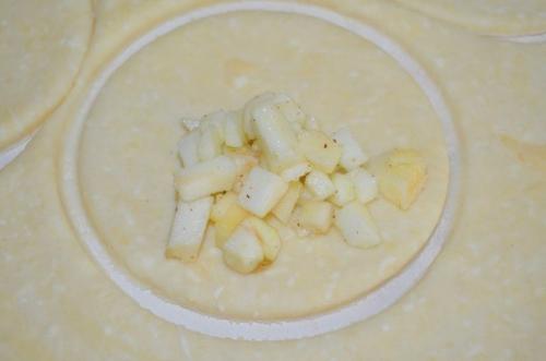 5. тесто раскатать в пласт толщиной 3-4 мм. Вырезать большой кружкой круги (8-10 см в диаметре), в центр выкладываем начинку и формируем пирожок.