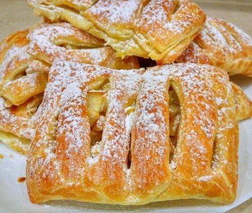 Тесто разрезать на 8 равных прямоугольников, выложить на 1 сторону начинку, второй стороной с прорезями накрыть и защипать.