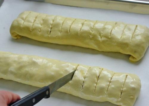 Загибаем края рулетов. Выкладываем рулеты на противень, застеленный бумагой. Смазываем яичной смазкой. Продольные надрезы на каждом рулете делайте.