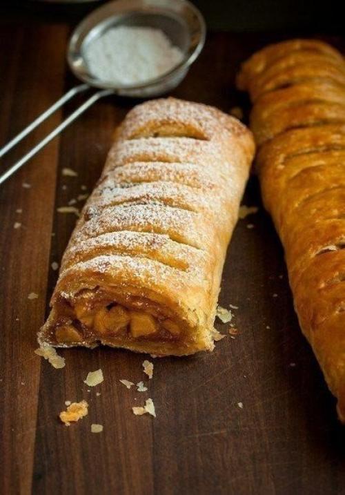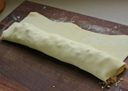 - 2 листа слоеного теста, -2-3 больших яблока, - пол чайной ложки корицы, - 2 столовых ложки сахара, - 2 столовых ложки муки, - полстакана рубленных орехов, - 3 столовых ложки коричневого сахара, - 2 столовых ложки обычного сахара, - 2 столовых ложки панировочных сухарей, - 1 яйцо 1 чайная ложка воды, взбить, для смазки.