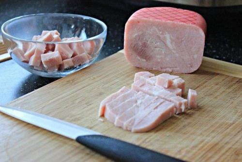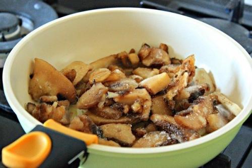 7. заливаем этой смесью грибы с ветчиной и готовим помешивая около 4 минут. Посолить, поперчить.
