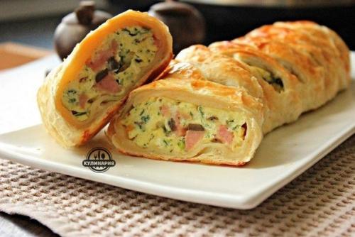 9. в центр выкладываем начинку. Плетем косичку. 10. Смазываем взбитым яйцом и выпекаем в разогретой до 190 с духовке 20-25 минут. 11. вынимаем из духовки, даем остыть. Приятного аппетита!