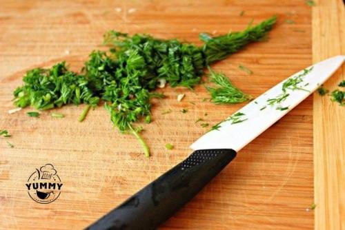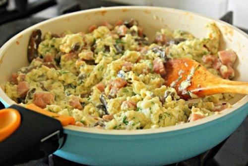 5. яйца слегка взбиваем и перемешиваем с сыром и зеленью. Заливаем этой смесью грибы с ветчиной и готовим, помешивая, около 4 минут. Солим, перчим.