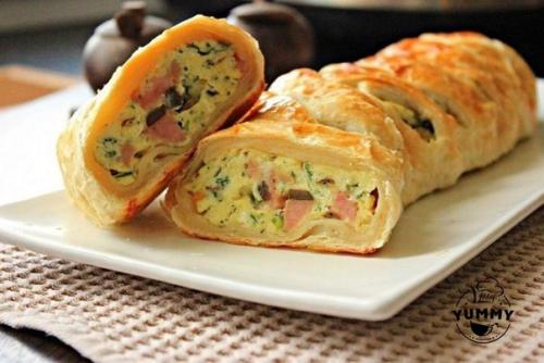 6. слоеное тесто тонко раскатываем. По бокам делаем ножом надрезы (одинаковое количество с каждой стороны. В центр выкладываем начинку. Плетем косичку.