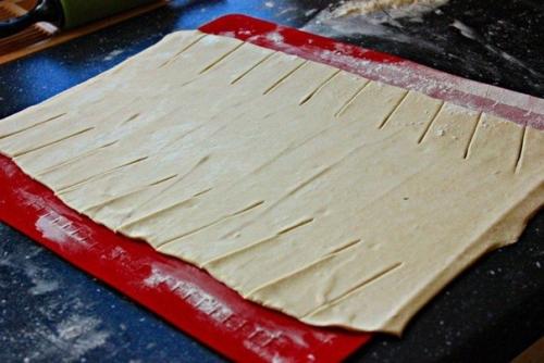 6. слоеное тесто тонко раскатываем. По бокам делаем ножом надрезы (одинаковое количество с каждой стороны. В центр выкладываем начинку. Плетем косичку.