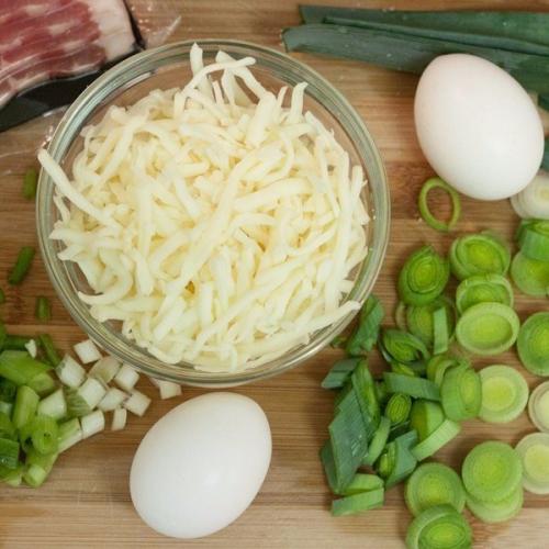 3. нарежьте бекон и выложите его поверх сыра. Сделайте небольшие отверстия между слоями начинки и туда разбейте яйцо.