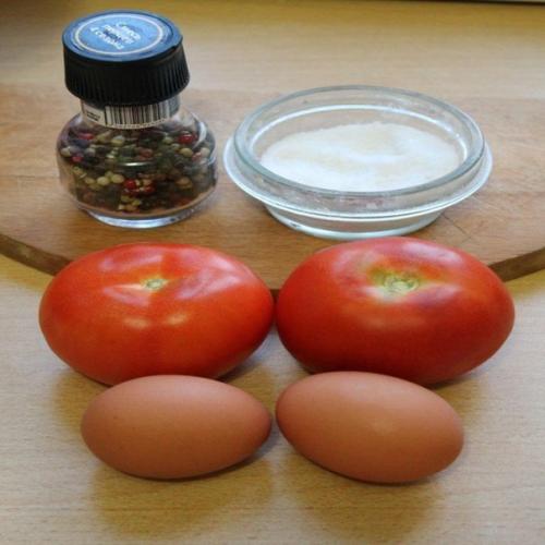 1. приготовить помидоры, яйца, соль и смесь перцев.