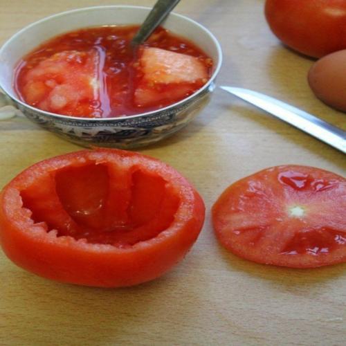 2. отрезать у помидоров верхнюю часть, ложечкой аккуратно вынуть мякоть.