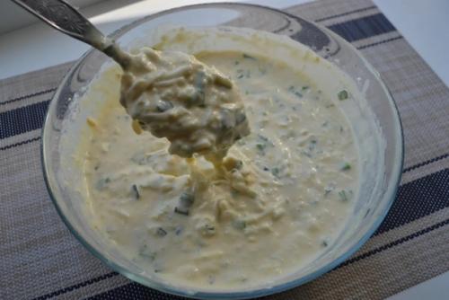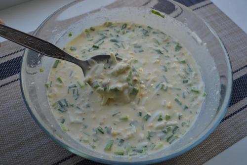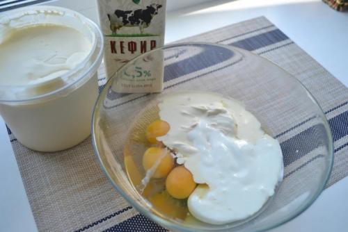 Далее яйца, уже сырые смешиваю с кефиром и сметаной, добавляю по вкусу соли, перемешиваю. Возможно, кто-то из вас скажет куда столько яиц? , Положите одно, тоже получится не плохо, у нас свои куры поэтому яиц в достаток.