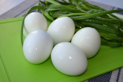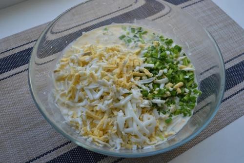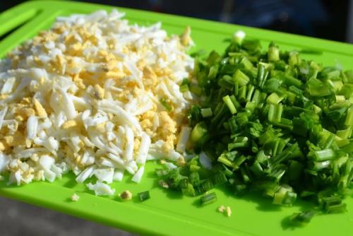 Итак, отваренные в крутую яйца тру на крупной терке, а зеленый лук мелко режу.