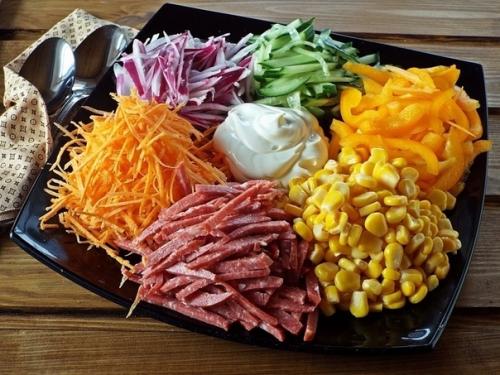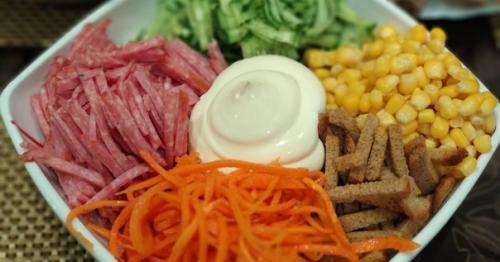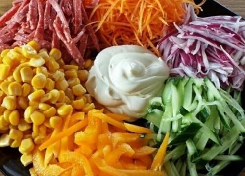 Помыть и нарезать тонкой соломкой перец и огурцы. Так же тонкой соломкой нарезать и колбасу. Морковь почистить и натереть на мелкой терке. Достаньте лук из маринада и удалите лишнюю жидкость. На большое плоское блюдо выложить все продукты отдельными кучками, не перемешивайте. В центр блюда майонез поместите. Очень яркое и необычное блюдо получится.