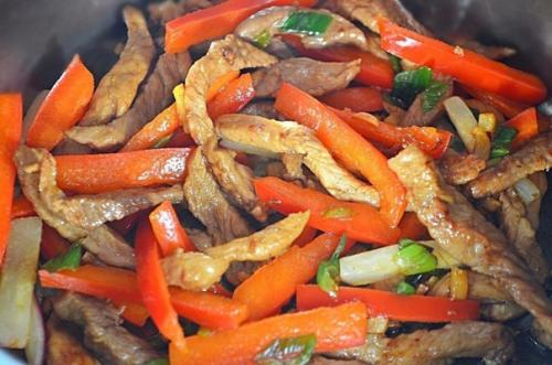3. в раскалённом воке на большом огне на растительном масле быстро обжарьте в течение пары минут подготовленное мясо. Мясо в сковороду кладем порциями, чтобы при выделении сока оно успело прожариться до появления золотистой корочки, а не тушиться. Овощи так же жарим порциями, пусть они останутся хрустящими и сочными внутри и сохранят свой яркий цвет. Не пережарьте стир фрай. Овощи должны получиться "на зубок".