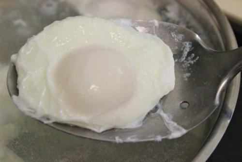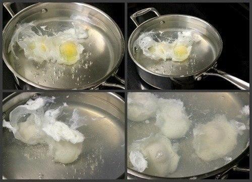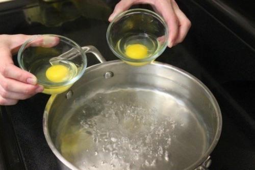 1. наполните сковороду почти до краев водой. Добавьте уксус. Доведите воду до кипения, а затем уменьшите огонь перед тем, как кидать яйца. Впрочем, как раз кидать не надо.