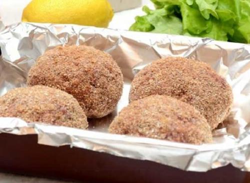 Свиного или говяжьего фарша, - 5 яиц, - 50 гр. сливочного масла, - черный молотый перец, - рубленая зелень - петрушка, укроп, тимьян (на усмотрение), - 1 ч. л. лимонного сока, - панировочные сухари или молотые грецкие орехи или овсяные отруби для панировки, - кориандр, - соль.