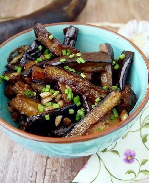 2. на сковороде разогрейте раст масло (2-3 ст л), поджарьте мелконарезанные 2 зубчика чеснока. Добавьте баклажаны, обжарьте. Всыпьте сахар и влейте соевый соус.