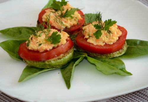Обжаренные кабачки выложить на блюдо, сверху помидор и сырно - морковный салат.