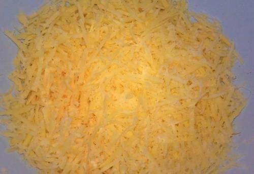 Когда яйца были готовы, остудила их, очистила и натерла так же, как и сыр, на средней терке. Чеснок через пресс пропустила.