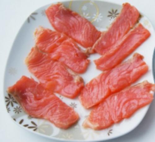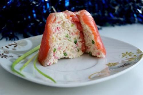 Шаг 3 берем любые маленькие чашечки и застилаем пищевой пленкой. По бокам чашечек выкладываем пластинки рыбы. Заполняем начинкой, слегка утрамбовывая. Накрываем пищевой пленкой и ставим в холодильник на ночь.