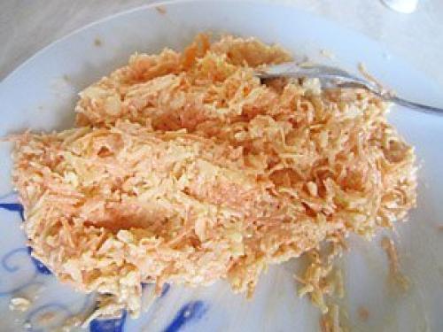 2. теперь мы готовим салат для колокольчика. Натрите на мелкой терке сырую морковь, сыр и чеснок.
