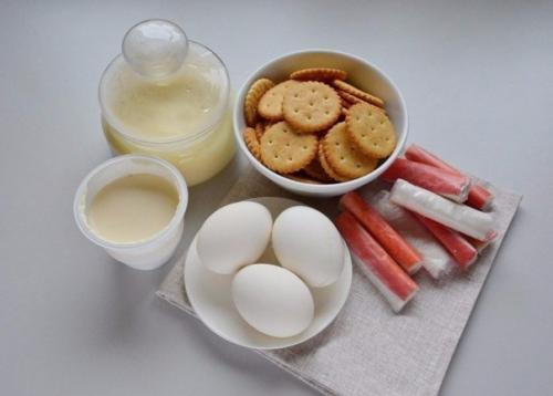 1. отварите яйца, остудите их и очистите от скорлупы. С крабовых палочек снимите обертку. Откройте сыр. Приступим!