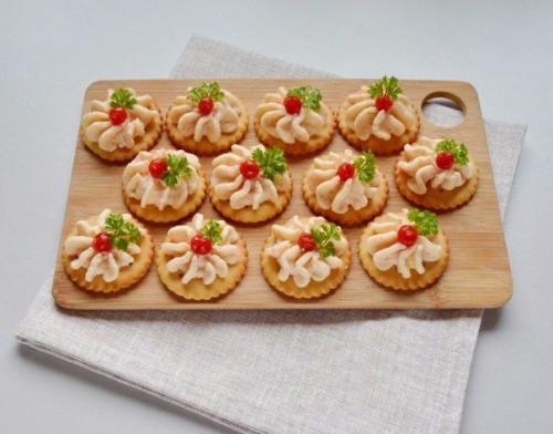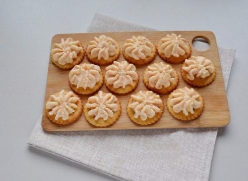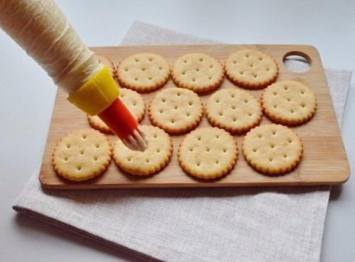 4. разложите печенье. Крабовой массой наполните кондитерский мешок. Насадка пусть будет самая широкая, чтобы масса не застревала. Высадите крабовый крем на крекеры.