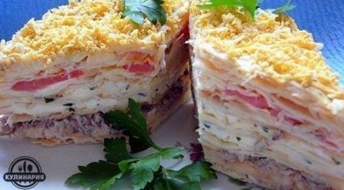 Ставим наш "Торт" минут на 10 в разогретую духовку или в микроволновку на 5 минут, пока не расплавится сыр. Перед подачей разрезать на порционные куски и украсить зеленью. Приятного аппетита!