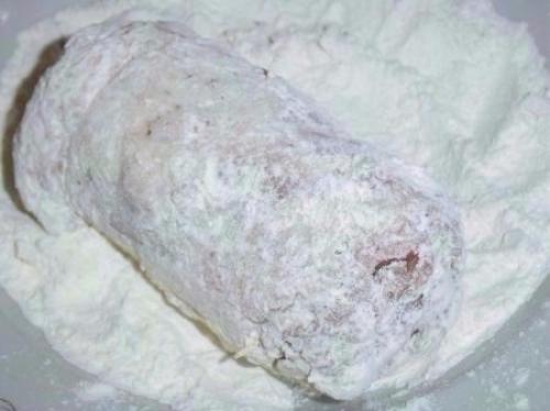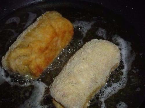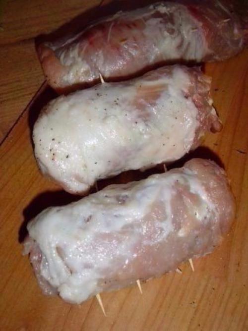 3. рулет скалываем зубочистками, в муке, яйцах и сухарях.