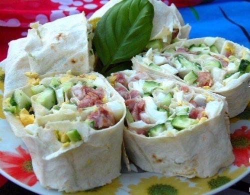 7. нарезаем лаваш поперек, выкладываем на тарелочку. Приятного аппетита!