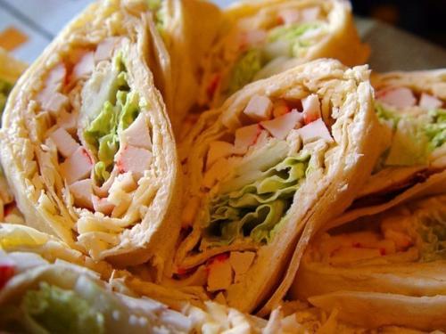 Развернуть лаваш (тонкий), положить на него начинку и свернуть рулетиками или конвертиками. Дать пропитаться 30 минут.