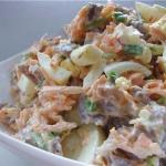 100 гр. Вареной колбасы или ветчины, ? 50 гр. Сыра (можно вместо сыра использовать подсоленный жирный творог), ? 1-2 Морковки, ? Зубчик чеснока, ? Майонез.